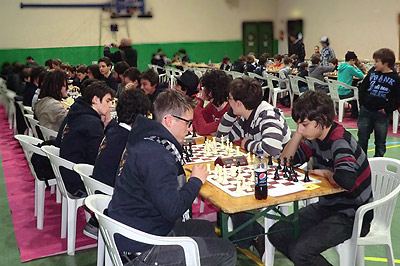 Dopo 10 minuti Jacopo commette una leggerezza per eccesso di sicurezza, visto che si trovava con pezzo e pedone in più: non vede uno scacco e tocca la donna, che alla fine deve utilizzare per difendere il re, donna in meno e perde quasi subito. Anche Alessio, in prima, perde, ma Bruno tira fuori il meglio di sé e il solido Adriano non perde un colpo così riusciamo a pareggiare.