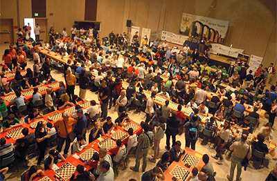 Fin da subito la prima cosa che ci ha impressionato è stata l’organizzazione mastodontica: la visione dall’alto, dietro ad una vetrata, della grandissima sala del centro congressi  riempita di una distesa infinita di tavoli con più di 500 scacchiere faceva davvero impressione! All’esterno poi vi era una marea di persone ,circa 1800 fra giocatori ed accompagnatori… Molte squadre erano riconoscibili dalle magliette o dai capellini che le caratterizzavano. Le flessioni della lingua ci facevano capire che tutta l’Italia era rappresentata. Non parliamo poi degli innumerevoli pullman che continuavano a girare intorno al centro congressi.